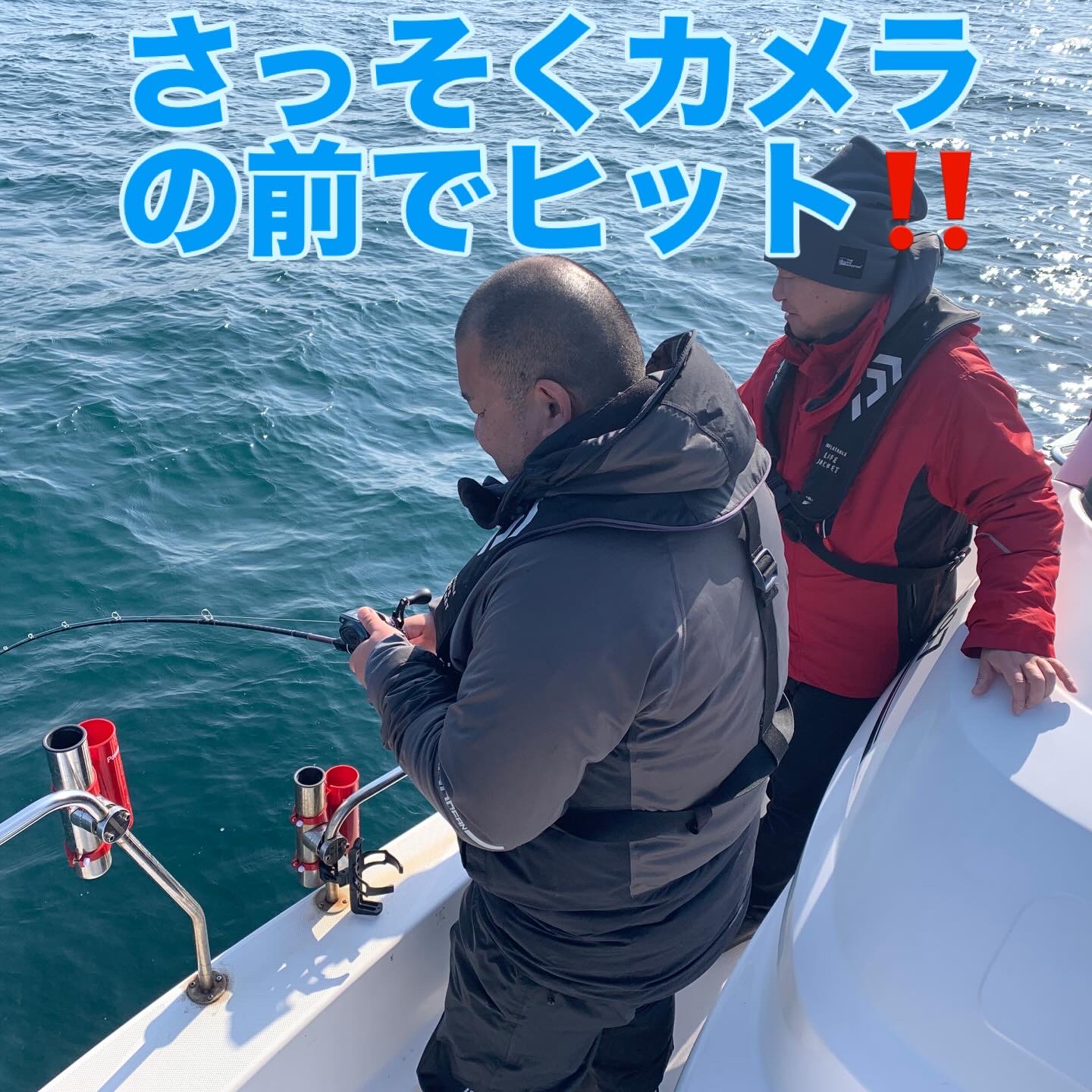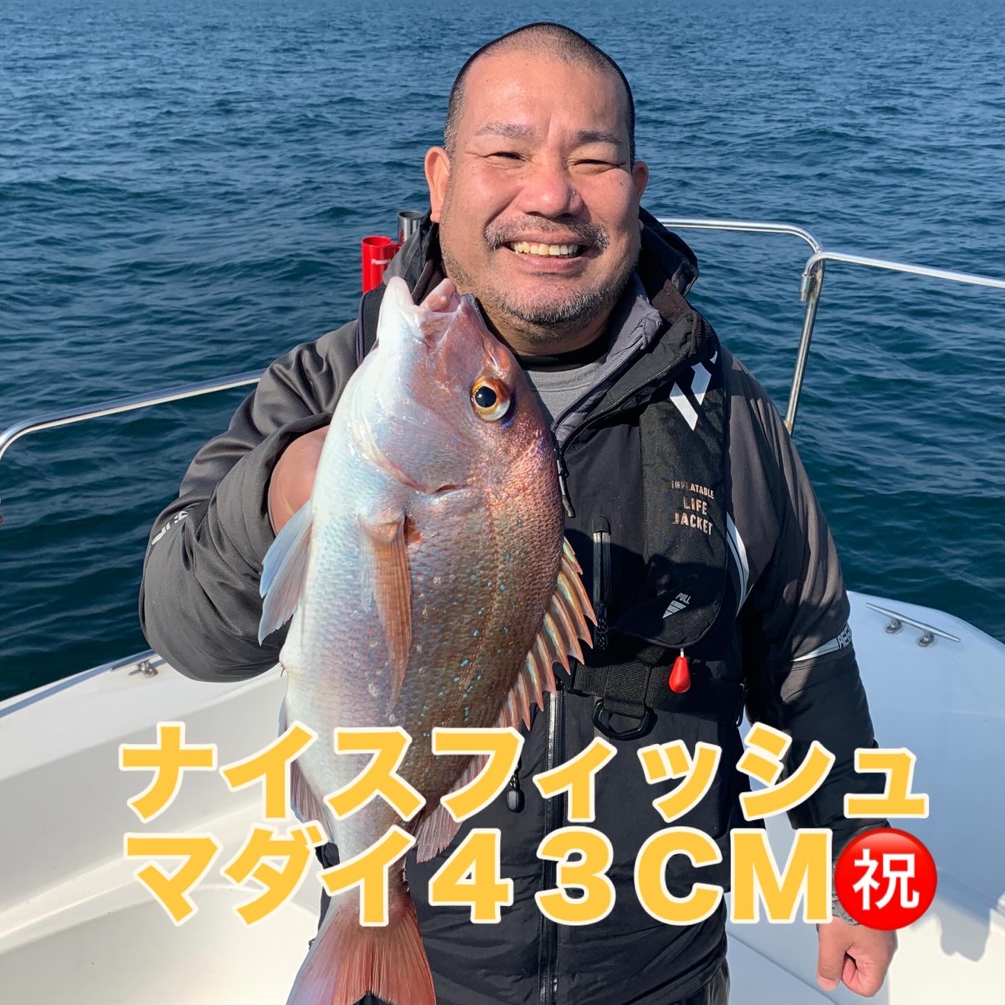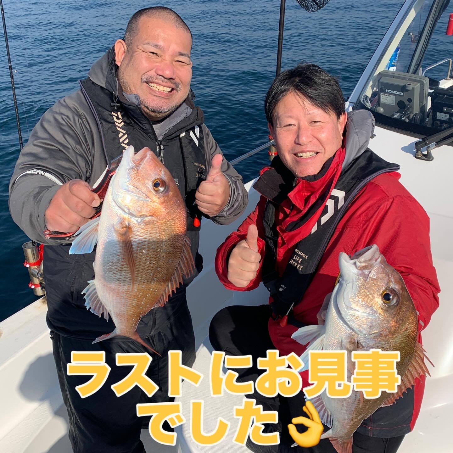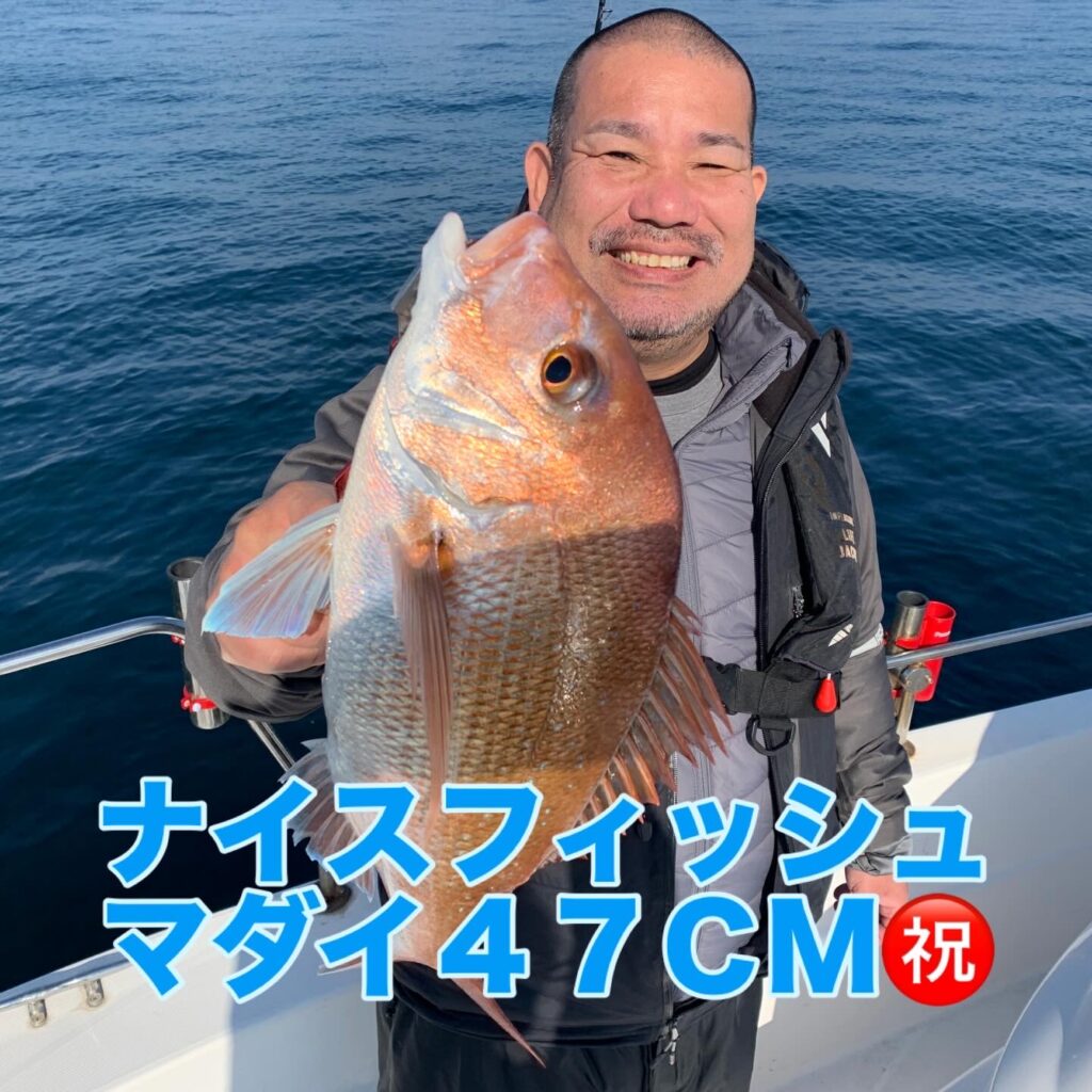 お客さまにもお1人ご協力頂き撮影スタッフと私の3名での出港で、短時間出港でしたが私以外のお2人に見事に良型マダイを釣り上げて頂く事が出来ました👌