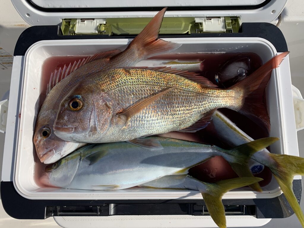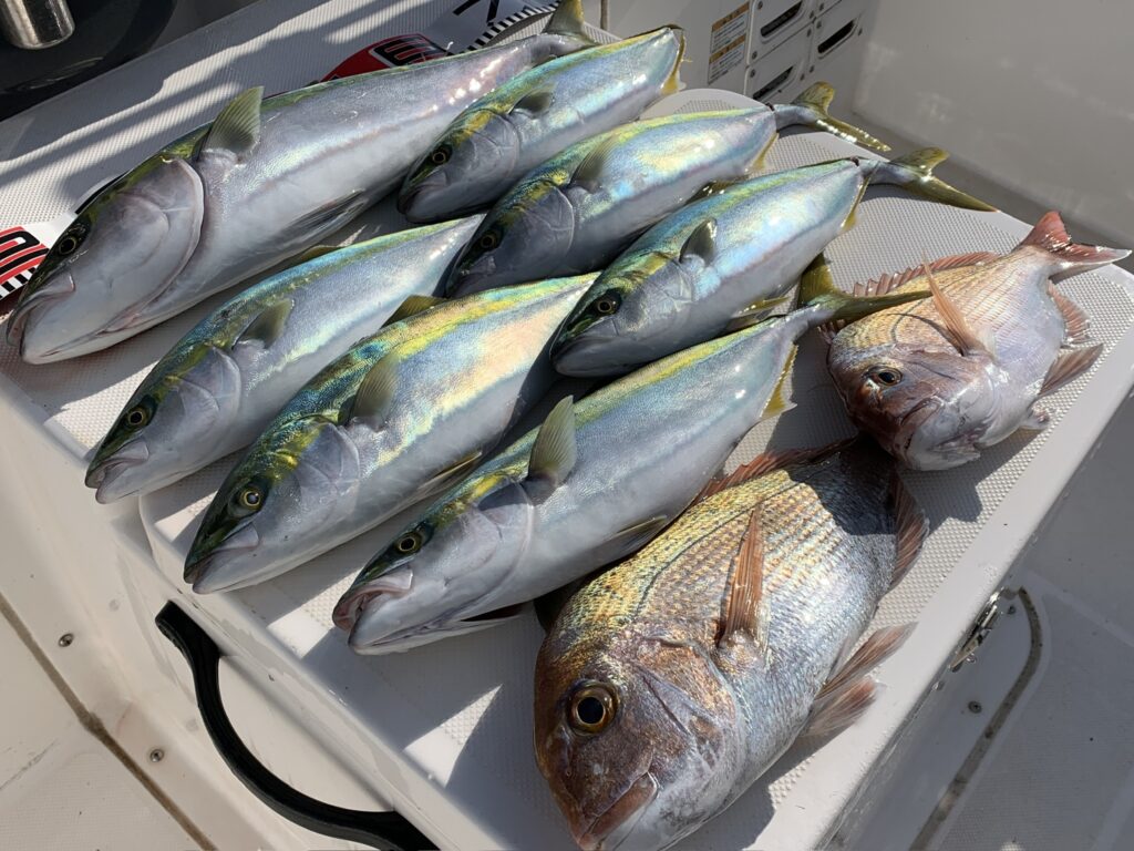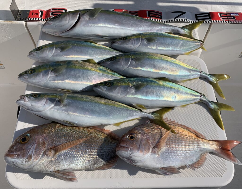本日の釣果は船中、ハマチ1匹(67cm)・ヤズ6匹(最大50cm)・マダイ(最大47cm)でした🎣