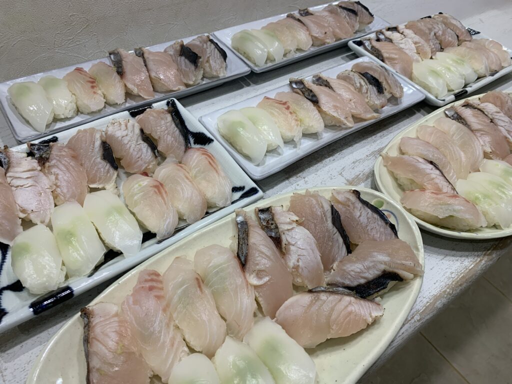 帰宅後さっそく釣れたてのマダイと、熟成させていたサワラ・アオリイカ・紋甲イカを使って握り寿司を作り家族皆んなで美味しく頂きました🍣🍺