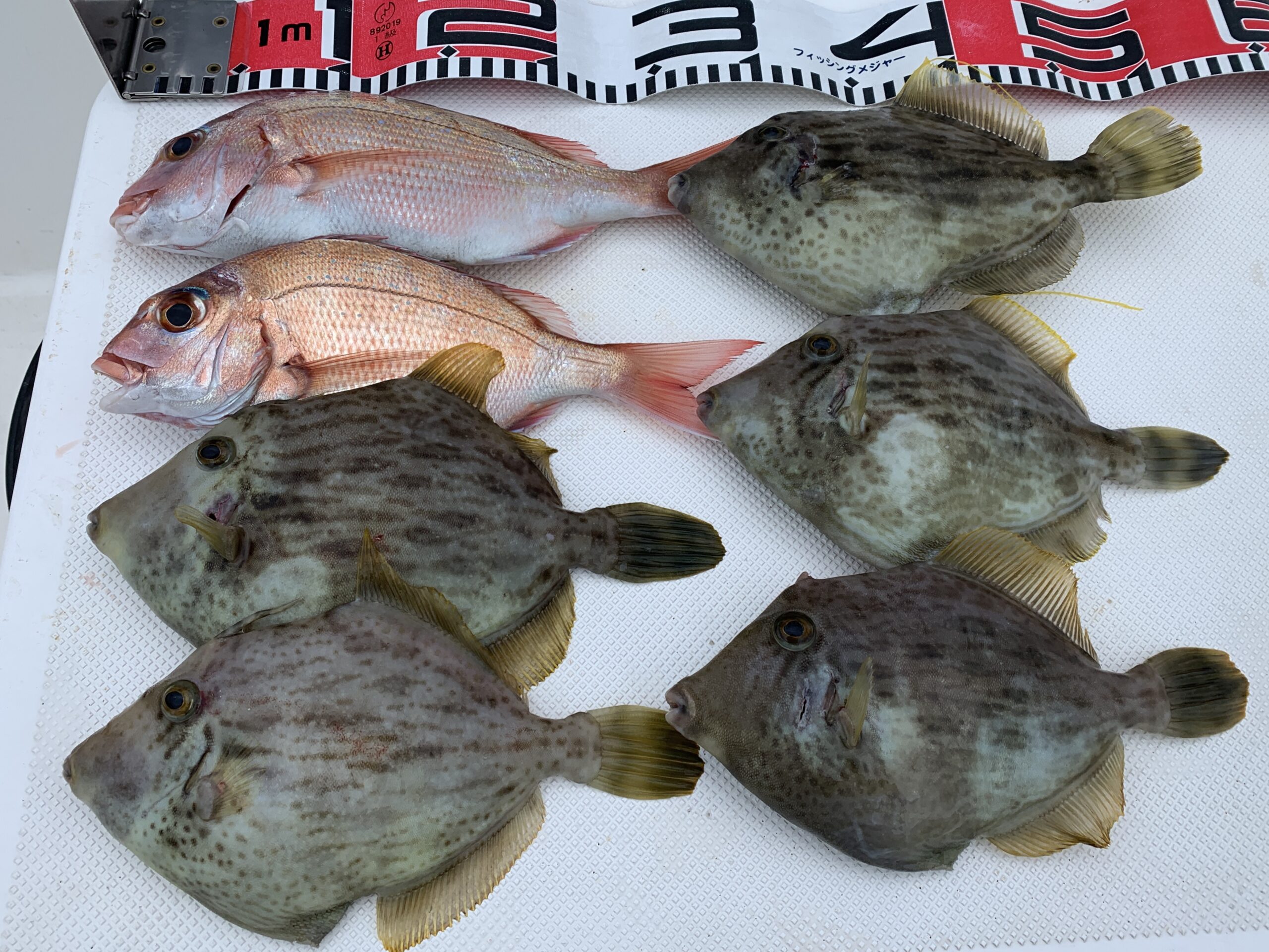 本日の釣果は船中、マダイ5匹(最大30cm・リリース含み)・丸ハギ10匹(最大25cm・リリース含み)・キュウセンベラ・トラギス多数でした🎣