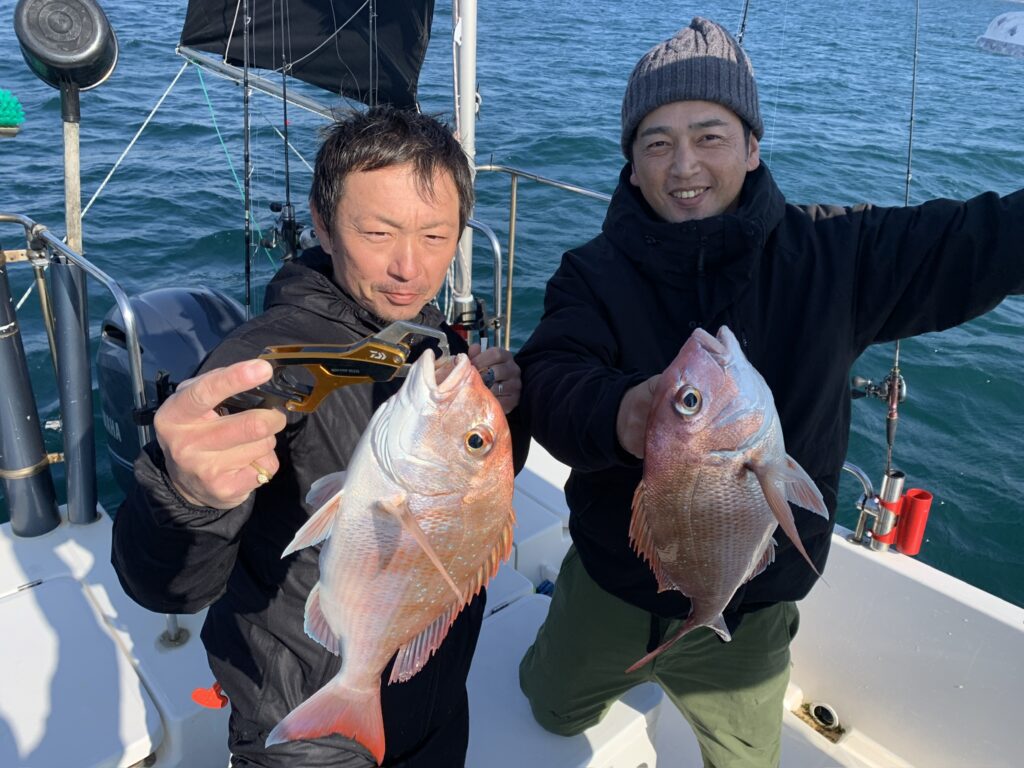 潮のタイミングに合わせテンポ良くポイントを回り、時合いに入ると毎流し誰かがマダイをヒット👌何度か船中ダブルヒット等も有りながら皆さまに時間一杯タイラバを楽しんで頂き、無事に良型マダイを全員安打で釣り上げて頂く事が出来ました👌