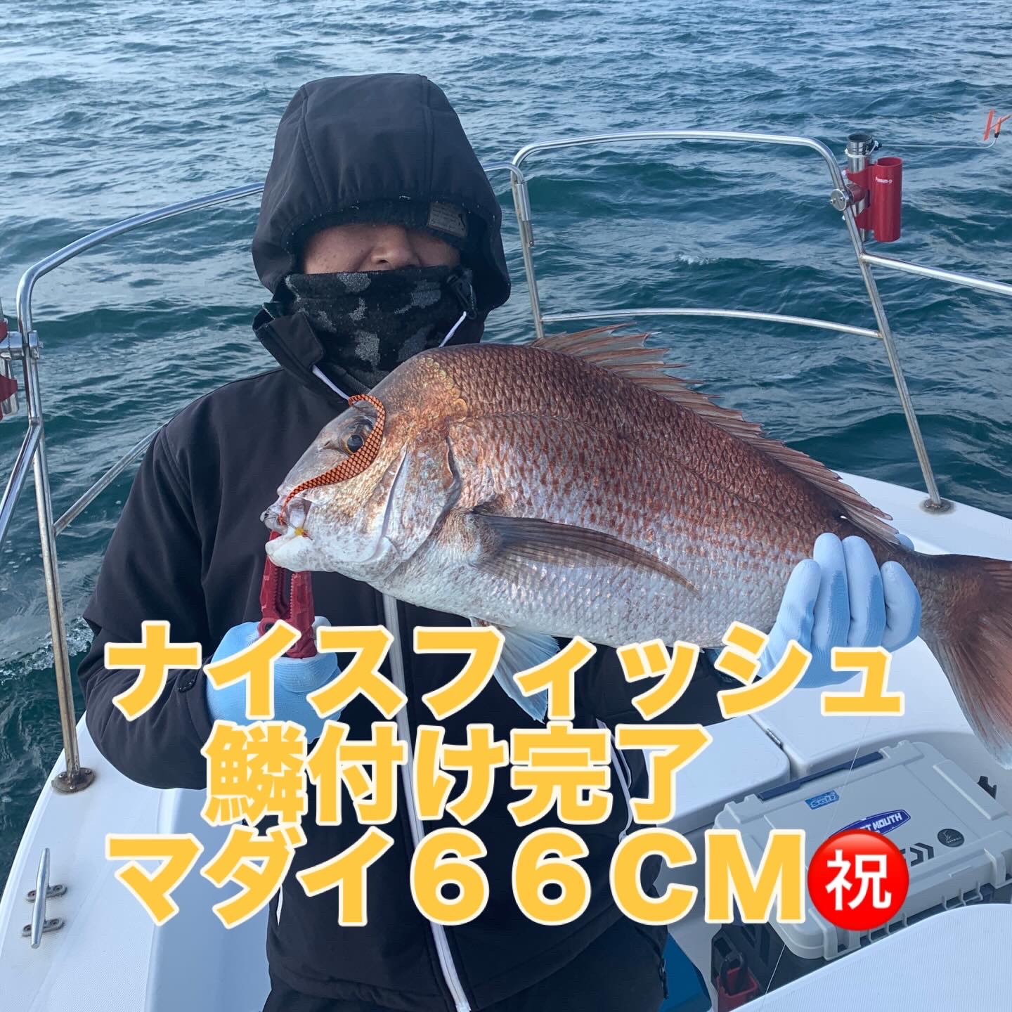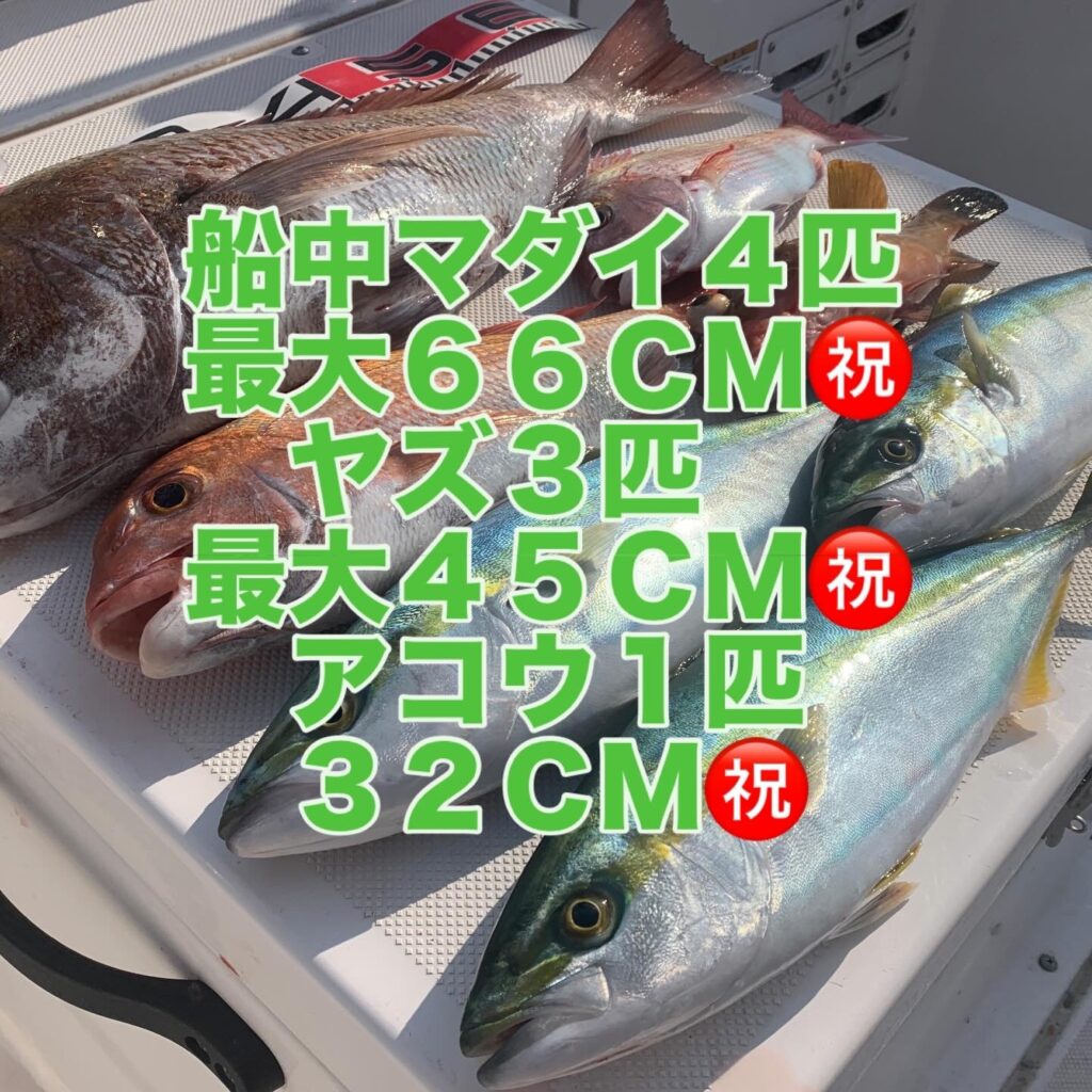 本日の釣果は船中、マダイ4匹(最大66cm・リリース含み)・ヤズ3匹(最大45cm)・アコウ1匹(32cm)でした🎣