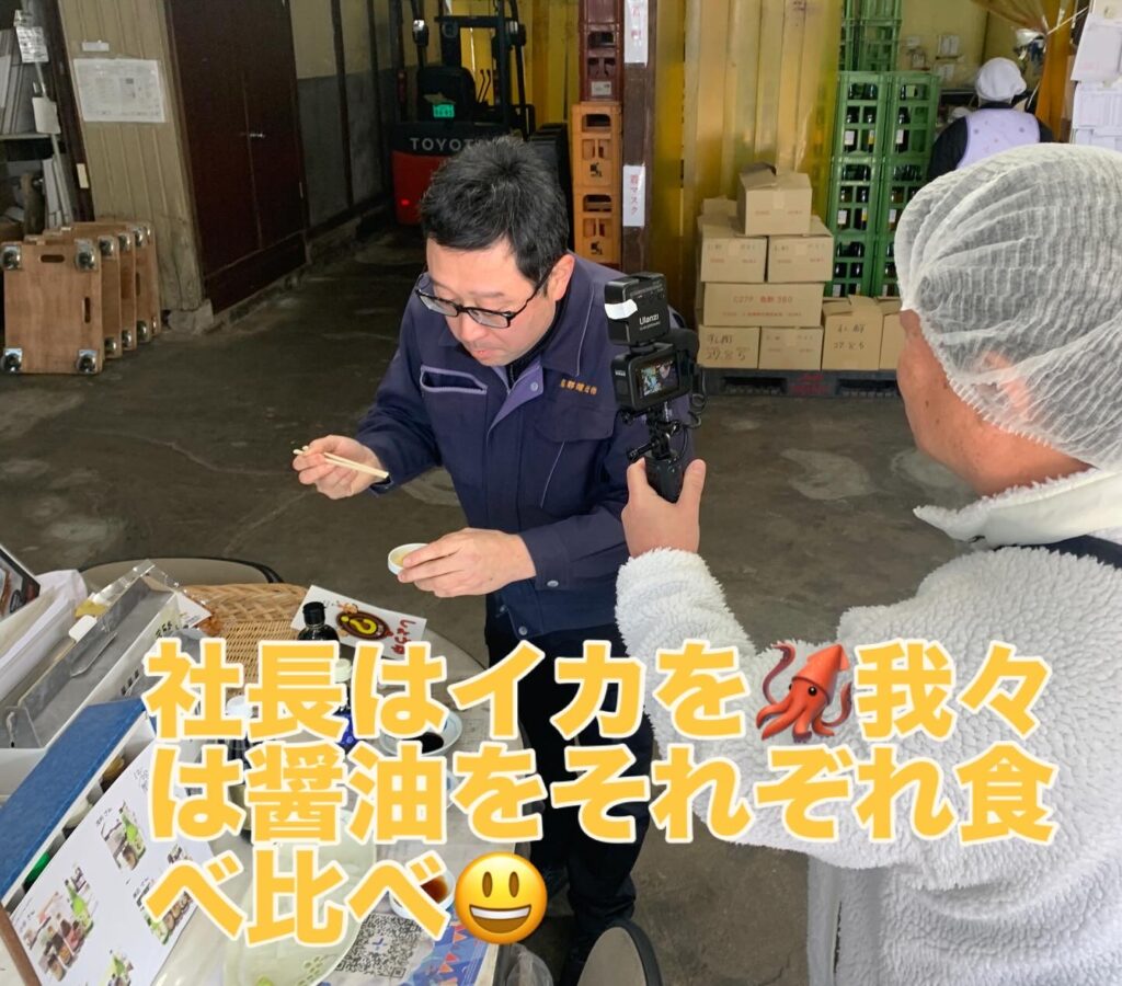 大正10年創業で今年の4月で105年目を迎える北条の老舗のお醤油の、製造過程や各種商品のご説明を丁寧に行って頂き、持参したアオリイカ&紋甲イカのお刺身で4種類のお醤油で食べ比べを行わせて頂きました👌
