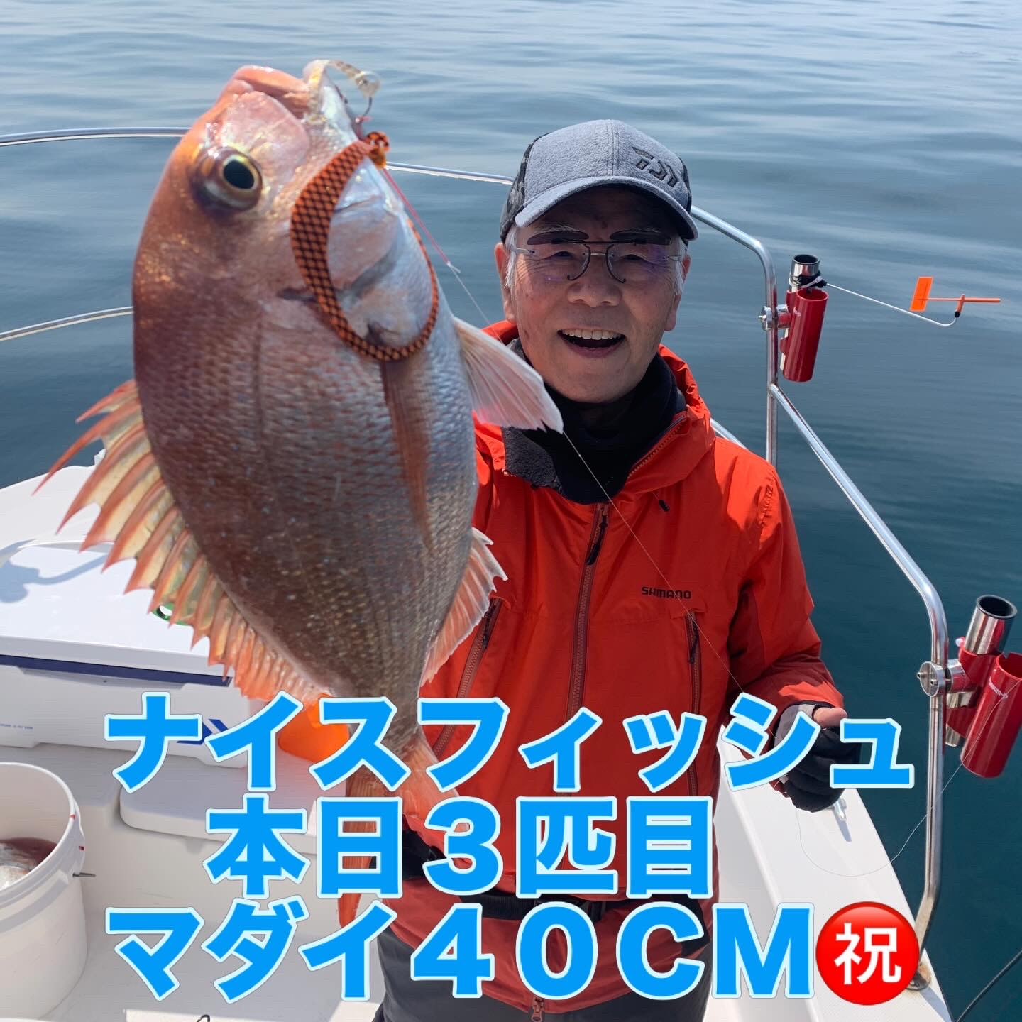 フィッシングスタートから数箇所のポイントでは何も無く凪倒れを覚悟してましたが、残り時間で何とか良い感じのベイト反応を見つけ丁寧にポイントを流してみると、見事にNEWタックルで狙いのマダイを1流し4打数3安打で3匹の良型マダイを釣り上げて頂く事ができ、無事にNEWタックルへの鱗付けを完了して頂く事が出来ました㊗️