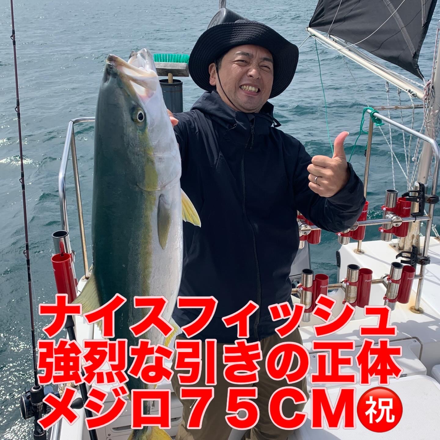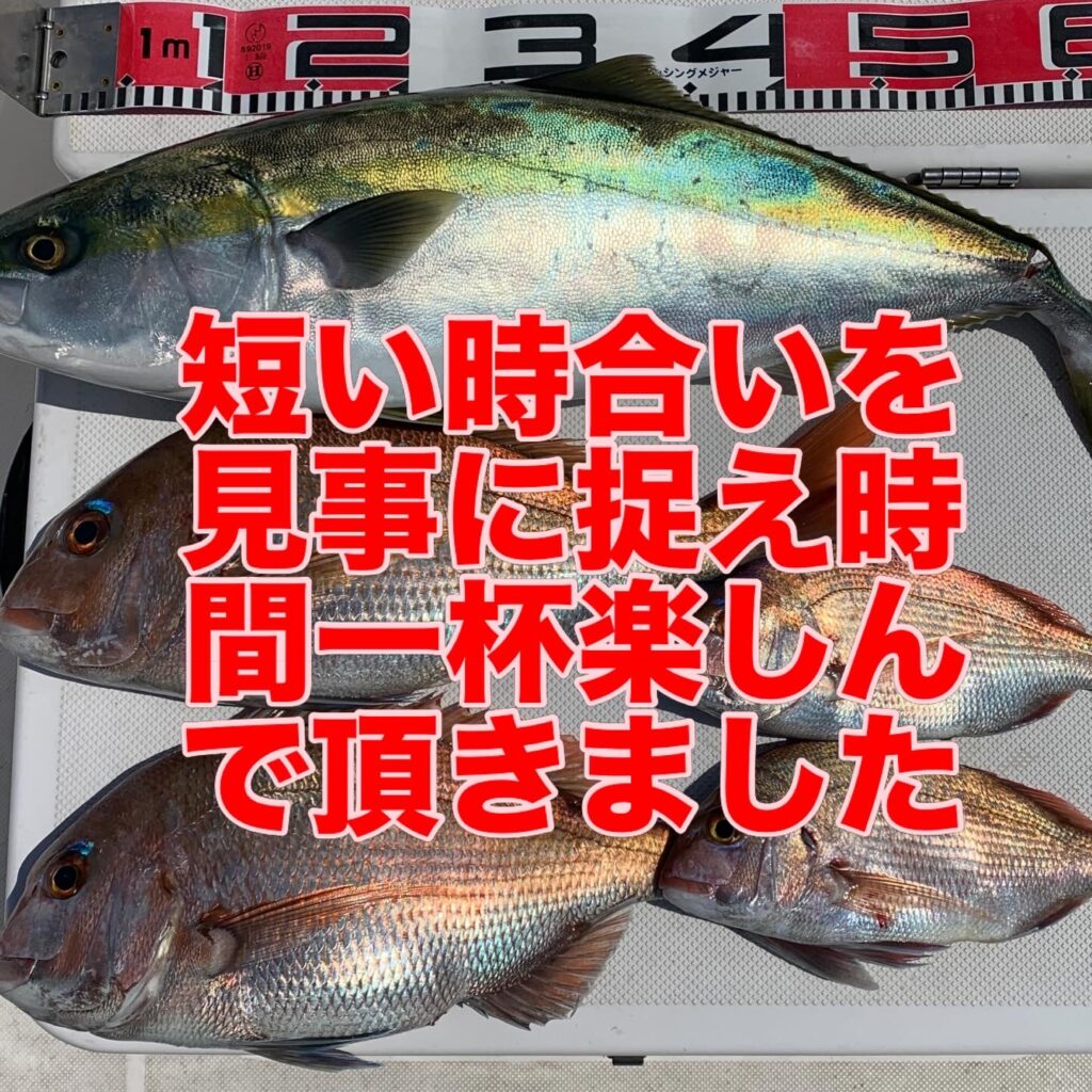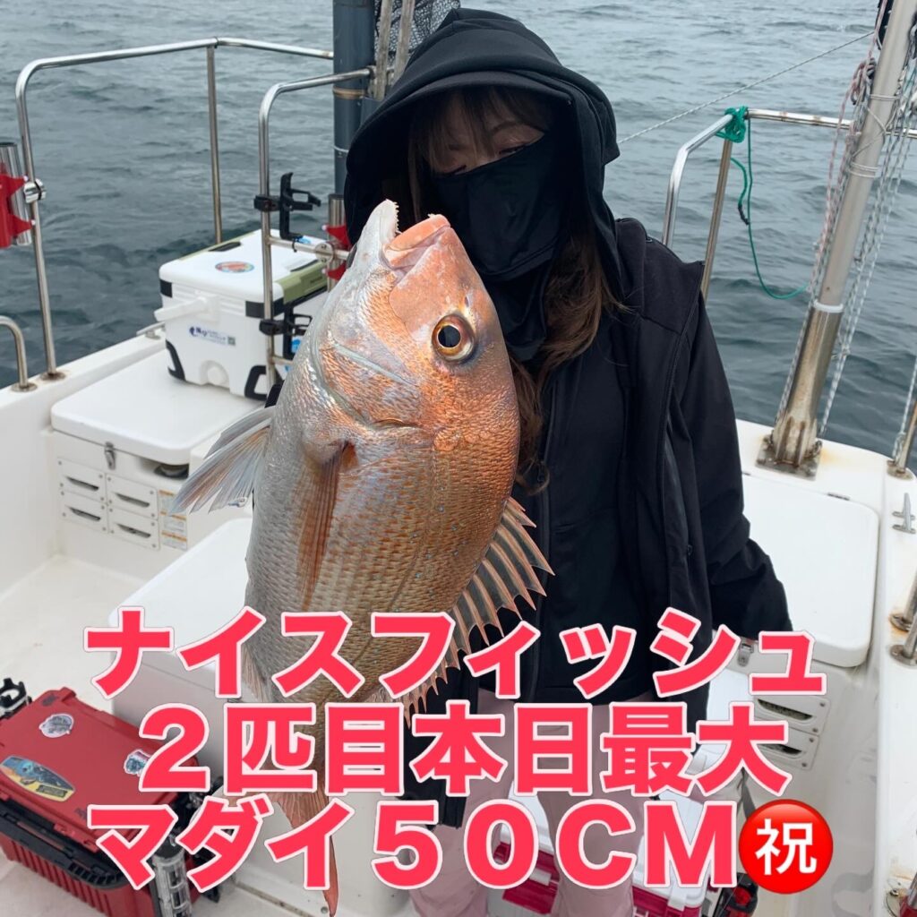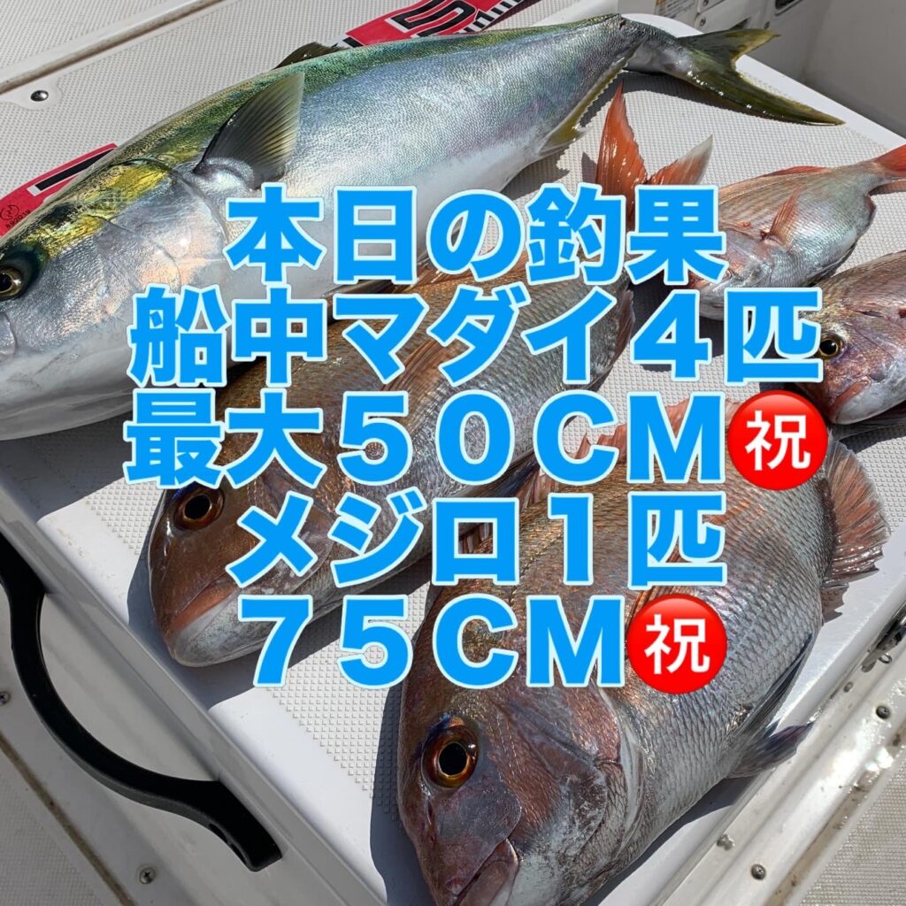本日の釣果は船中、マダイ4匹(最大50cm)・メジロ1匹(75cm)でした🎣
